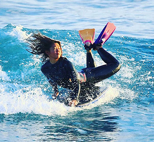 しかし、途中で自分が本当は何をしたいのか分からなくなり悩んでいたころ、父が経営するサーフショップ『Sabbia surf』の練習会を観に行き、ボディーボードに乗る会員さんの楽しそうな笑顔をみて私もやってみたい!ボディーボードなら水泳での経験も活かせる!と思いました。